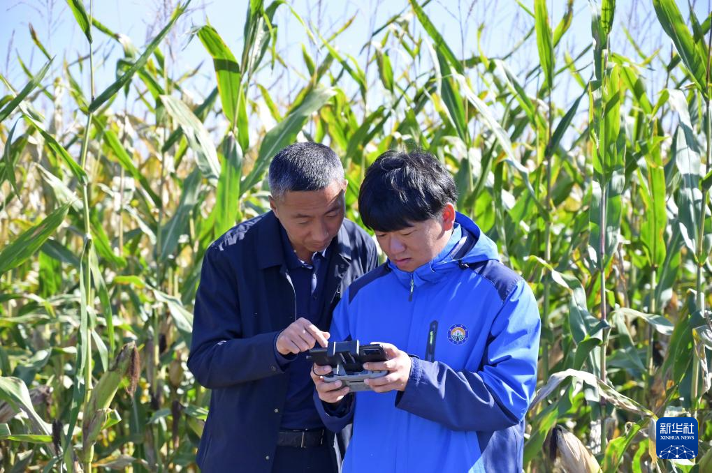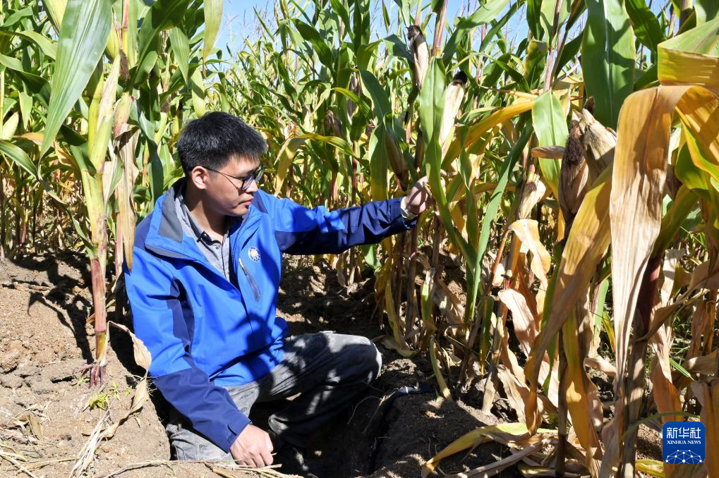 9月27日,研究人员在位于双鸭山市友谊县的友谊农场查看玉米长势。新华社记者 石枫 摄