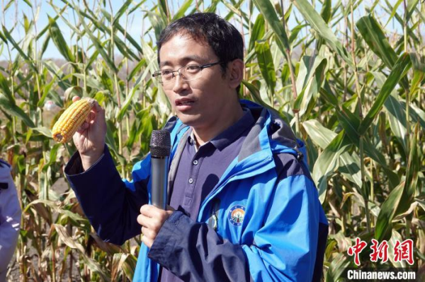 友谊农场一处玉米示范地里,刘焕军研究员接受媒体采访介绍“三江模式”。中新网记者 孙自法 摄