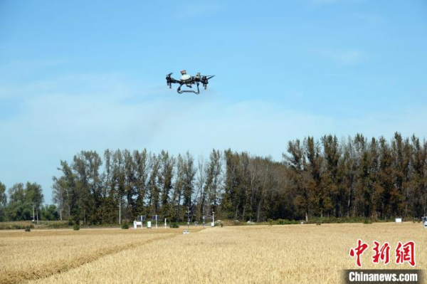 北大荒曙光农场,项目团队用大型无人机在示范农田上空开展相关作业。中新网记者 孙自法 摄