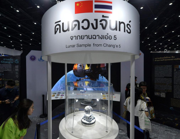 这是2024年7月23日在泰国曼谷举行的“2024泰国未来科学力量展览会”上拍摄的嫦娥五号月壤样品展台。(新华社发 拉亨 摄)