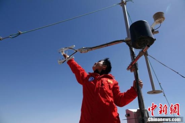 图为观测站现场,第二次青藏科考队员、中科院空天院博士生陈旧对观测设备进行维护。孙自法摄