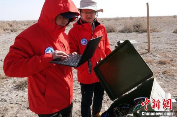 第二次青藏科考队员、中科院空天院郑超磊副研究员(左)、蒋敏助理研究员在观测站现场开展数据读取工作。孙自法摄