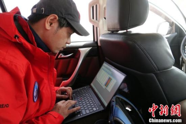 观测站现场,第二次青藏科考队员、中科院空天院郑超磊副研究员随即在车上进行数据初步检查处理工作。孙自法摄