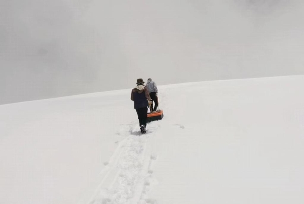 与此同时,科研人员拖着冰川雷达测厚仪,在东绒布冰川表面沿着“Z”字形轨迹,向下发送探测波获取厚度数据。