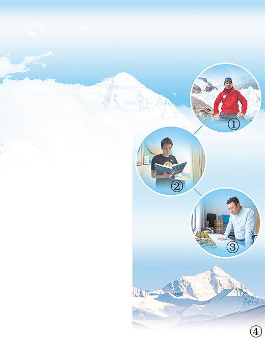 图①:杨威在珠峰东绒布冰川。朗加确珠摄 图②:吴晨在查阅资料。本报记者 徐驭尧摄 图③:拉珠在观察植物生长状况。本报记者 徐驭尧摄 图④:阳光照射下的珠峰。本报记者 徐驭尧摄