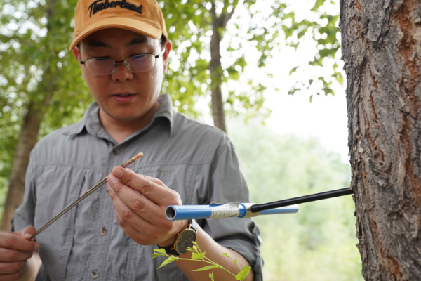 正在新疆天山北坡开展科学考察的贾小旭一边钻取一棵杨树的树芯,一边倾听树干中发出的声音,钻孔处喷出一股水流,令他惊叹不已。