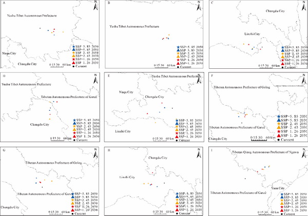 未来气候情景下青藏高原受胁鸟类适宜栖息地重心迁移格局