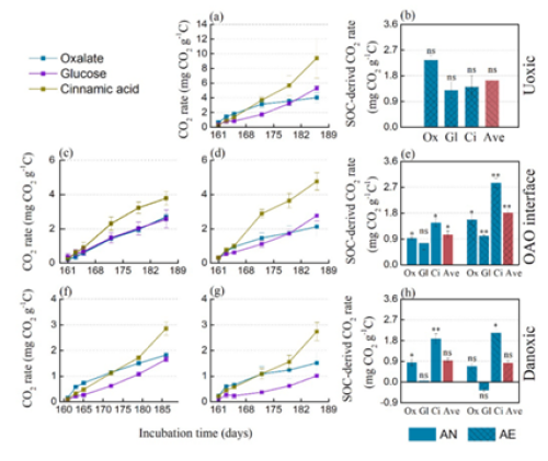 该研究的主要成果如下:(1)土壤碳质量和微生物活性。在三层土壤中,表层土壤含有大量糖类等简单有机碳,过渡层和深层土壤的脂肪类及铁碳等复杂有机碳含量高,过渡层的腐殖化程度最高(图2a)。同时,表层的微生物量及活性最高,其次为深层土壤,过渡层最低(图2b)。(2)土壤碳排放潜势及对增温的响应。在三层土壤中,表层土壤CO2速率最高,其次为深层土壤,过渡层土壤CO2排放速率最低。在厌氧状态下,增温显著增加了表层和深层土壤CO2排放,对过渡层CO2排放没有显著影响,说明厌氧状态下过渡层CO2排放对增温不敏感;在有氧状态下,增温显著增加了三层土壤CO2排放,体现了厌氧环境对过渡层增温不敏感特性的重要性(图3)。(3)土壤碳排放对外界碳输入的响应。在三层土壤中,表层土壤对简单物质如草酸较为敏感,深层土壤对复杂物质如肉桂酸较为敏感,而过渡层对简单和复杂物质均敏感,说明长期的水位波动干扰使过渡层微生物处于严重的营养限制状态,而外界物质输入缓解了微生物营养限制,促进了土壤有机碳分解和CO2排放(图4)。(4)过渡层的特性及作用。对比三层土壤对增温和外界物质输入的响应发现,表层和深层均对增温敏感,但对输入物质的敏感性具有选择性,而过渡层土壤对增温不敏感,对外界物质输入敏感,体现了过渡层处于严重营养限制状态下,且此状态下土壤碳颇为稳定(图5)。基于此,本研究提出了除“酶闩”“铁门”理论之外的另一泥炭沼泽土壤碳库稳定机制,即维持稳定的过渡层,首先减缓外界物质输入以降低对过渡层的激发,其次保护过渡层对温度的不敏感性。