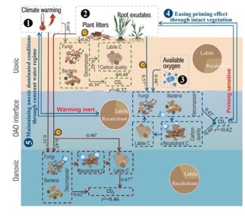 图1.水位波动影响的土壤剖面及不同层碳排放对气候变化的响应