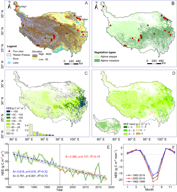图1.青藏高原高寒草地NEE的空间预测和时间趋势。(A)青藏高原高寒草地的通量观测站分布和地形图;(B)高寒草地植被类型分布图;(C)1982-2018年均NEE空间分布图;(D)1982-2018年NEE趋势的空间分布图;(E)1982年至2018年区域年均NEE的时间变化;(F)1982年至2018年的月均NEE变化。