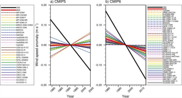 图1.(a)CMIP5和(b)CMIP6模式以及模式平均和观测资料的地表风速异常(ms-1)的线性趋势。CMIP5和CMIP6模式的计算年份分别为1979-2005年和1979-2014年。