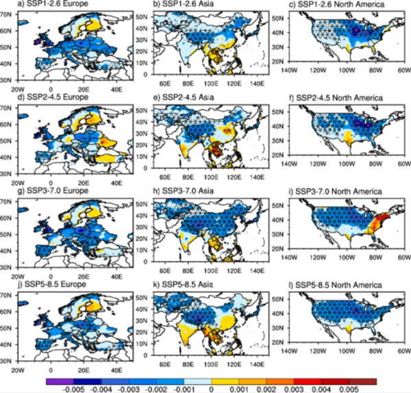 图2.SSP1-2.6(a-c)、SSP2-4.5(d-f)、SSP3-7.0(g-i)和SSP5-8.5(j-l)情景下,欧洲(a、d、g和j)、亚洲(b、e、h和k)和北美洲(c、f、i和l)的未来时期(2050-2099)相对于历史时期(1965-2014)的地表风速趋势(ms-1year-1)。交叉区域表示23个CMIP6模式中超过19个对变化符号达成一致。