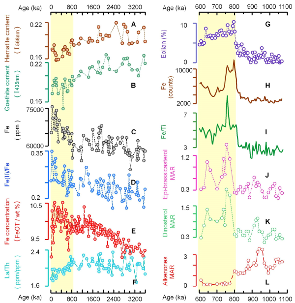 80万年后,随着输入太平洋的全铁和Fe2+增多,PC932孔浮游植物群落结构发生转型,由固碳作用相对较弱的alkenones(颗石藻、钙质)转变为更强的epibrassicasterol(硅藻)和dinosterol(鞭毛藻)。