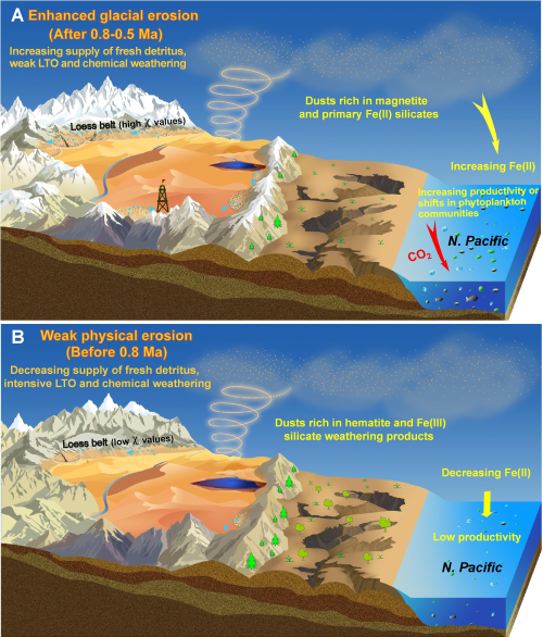科研团队通过研究西昆仑山黄土古粉尘序列样品以及小于5微米黄土颗粒组分的铁氧化物种类和含量,进一步发现在中更新世转型期(约80万年)开始,随着全球变冷以及北半球中高纬地区山地冰川的急剧增加,青藏高原的冰川侵蚀作用显著增强,导致塔里木粉尘铁氧化物突然从赤铁矿(Fe3+)转变为磁铁矿(Fe2+和Fe3+),同时铁元素总含量和高生物活性的二价铁含量急剧增加。计算结果表明,中更新世气候转型期以后,亚洲内陆干旱区输送至北太平洋的铁元素总含量以及二价铁通量分别增加了约70%和约120%,促进了北太平洋生物物质的繁盛,并可能改变了浮游植物种群结构,大量消耗了大气中二氧化碳,造成全球气候进一步变冷。
