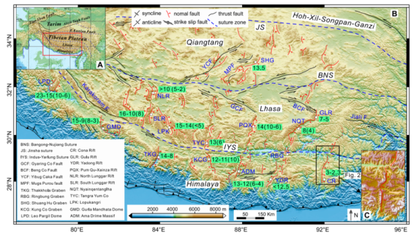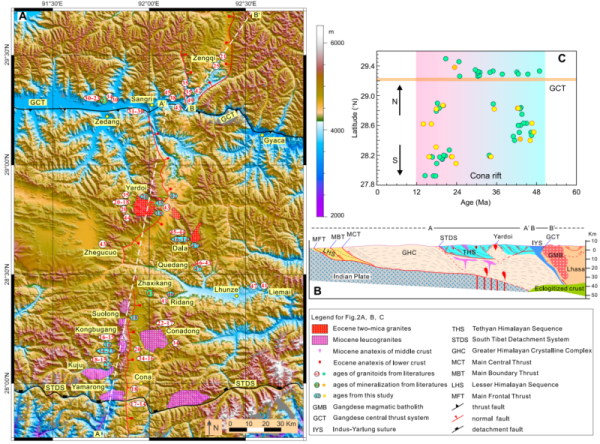印度与亚洲大陆新生代持续的汇聚挤压,在藏南形成了一系列东西向(如拉萨地区的冈底斯山、特提斯喜马拉雅的康马-库拉岗日山)及南北向(如拉萨地区的念青唐古拉山和隆格尔山和特提斯喜马拉雅的雅拉香波-空布岗山)的山脉(图1)。目前,普遍认为这些东西向山脉的形成主要与南北向汇聚下的挤压变形和伸展挤出有关。然而,南北向山脉的形成机制尚不清楚。 大量的野外观察发现,南北向山脉主要位于高地形区域,且多为南北向裂谷的肩部(图1),表明其形成与地表隆升及东西向伸展密切相关。值得注意的是,很多南北向山脉出露有新生代淡色花岗岩,显示了二者可能具有密切的成因联系——南北向构造(山脉+裂谷)的形成很可能与地壳深熔有关。因此,深熔花岗岩可能是解决南北向山脉形成机制的关键对象。