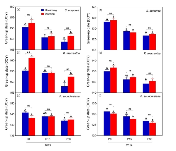 图2.不同增温与增雨处理对优势物种返青期的影响。P0:自然降水,P15:增雨15%,P30:增雨30%。大写与小写字母分别为不增温与增温处理的方差分析,不同字母代表存在显著差异。* 表示P<0.05,** 表示P<0.01。