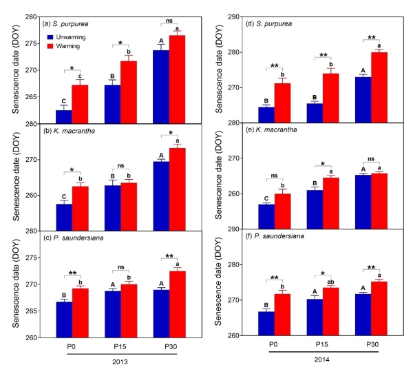 图3.不同增温与增雨处理对优势物种枯黄期的影响。P0:自然降水,P15:增雨15%,P30:增雨30%。大写与小写字母分别为不增温与增温处理的方差分析,不同字母代表存在显著差异。* 表示P<0.05,** 表示P<0.01。