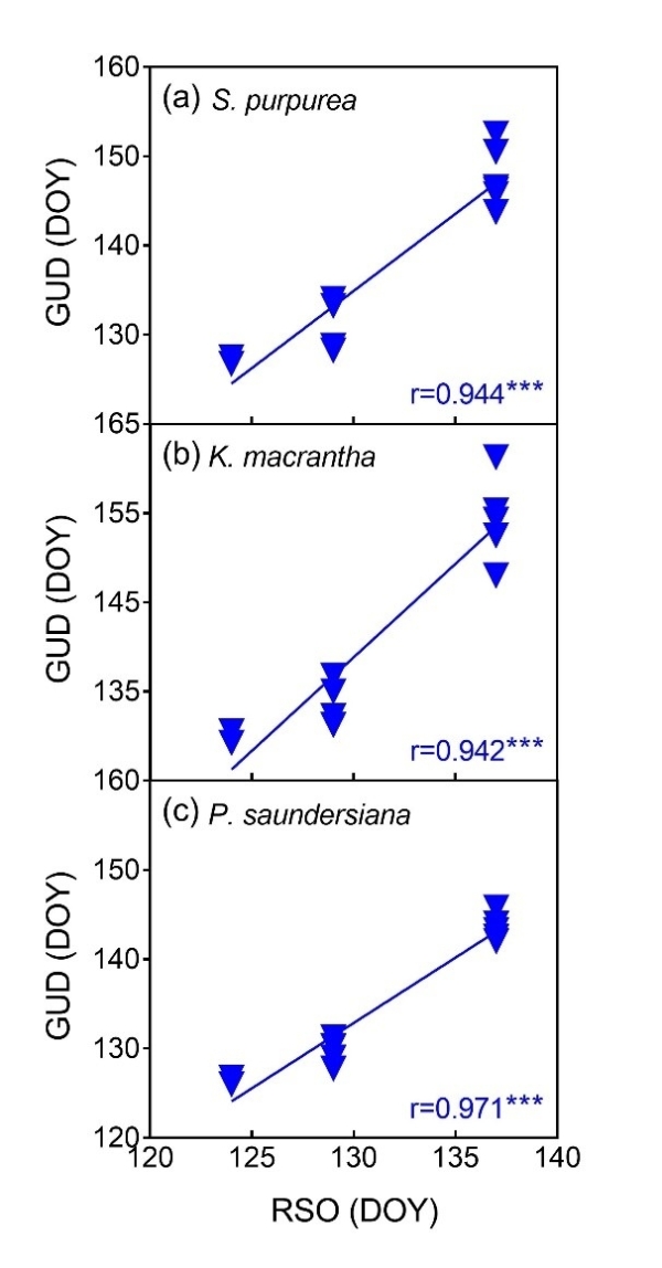 图4.雨季来临时间(RSO)与3个优势物种返青期(GUD)的关系