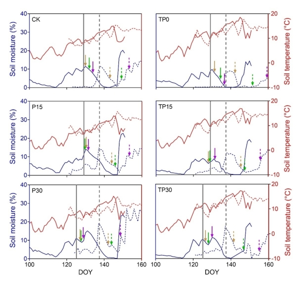 图5.不同实验处理中优势种返青期与雨季来临时间和日均土壤温度和水分的关系。灰色竖线代表雨季来临时间,不同颜色箭头代表3个优势物种返青期;所有虚线与实线分别表示2013年、2014年的数据。