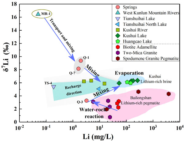 此外,随着地表富锂水体的迁移,流体中的可溶性锂在持续蒸发和径流混合作用过程中表现出不断富集的趋势,表明干旱条件下的深部富锂流体的汇入与强蒸发作用是盐湖卤水中Li快速富集的主要机制。而沿径流方向Li含量与δ7Li值具有一定的正相关性也表明,即使在高寒环境下的小流域尺度,次生矿物对6Li的吸附效应仍然存在,并引起一定程度的锂同位素分馏。
