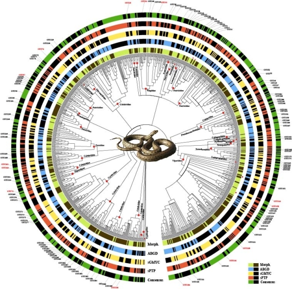 研究表明:1.中国蛇类物种多样性被低估,保守估计中国蛇类存在至少36个未被描述的新种。这些未被描述的新种主要分布在游蛇科、水游蛇科和蝰科。除此之外,DNA条形码的结果还提示传统分类可能严重低估了中国蛇类的物种多样性。2.DNA条形码能够有效鉴定大部分的中国蛇类到物种水平,但是对于存在分类争议、不完全谱系分选、基因渐渗和复杂的物种形成及分化机制等类群,DNA条形码表现出较低的识别效率。3.部分物种DNA条形码数据分析呈现一定的谱系地理结构,如“海岛-大陆”分化模式(台湾海峡和琼州海峡的隔离作用)和中国“东-西”分化模式。