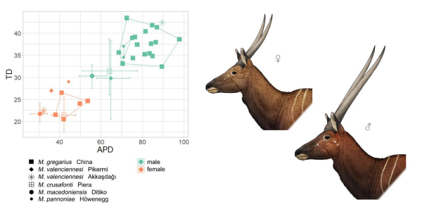图2. 雌雄性中新羚牛的角心差异比较以及群中新羚牛的复原图(陈瑜绘)