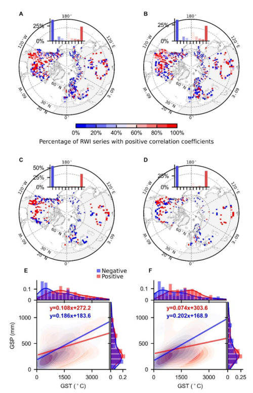 科研人员综合应用北半球非热带地区树轮轮宽序列和日尺度气象因子,探索了1948年至2014年树木生长对物候变化响应的空间格局与潜在机制。结果表明,生长季提前促进树木生长的区域主要分布在北纬60°以北,包含欧洲大部分区域与北美东西海岸区域;不利于树木生长的区域主要在北美中西部与青藏高原部分地区。对比气候特征发现,促进生长区域的气候相较于抑制区域,生长季水热比更高(图1)。