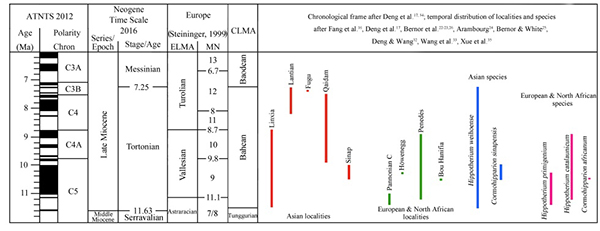 此前,渭河和贾氏两个种被归入Hippotherium亚属,而随着近年来关于该分类单元逐渐清晰的认识,这一单元可提升为属。渭河和贾氏种在大部分化石点共生,通过对新老材料的全面对比,证实这两个种之前被认为是明显差异的特征系种内变异和保存状况所致,二者应合并为一个种,即渭河古三趾马Hippotherium weihoense。根据临夏盆地的古地磁研究,首次出现渭河古三趾马分布记录地层的年代为11.5 Ma。维也纳盆地的Cormohipparion sp.应归为H. primigenium,年代被估计为11.4-11 Ma。因此,渭河古三趾马是旧大陆最早的三趾马,三趾马事件应更名为古三趾马事件(图2)。