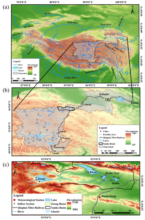 图1.可可西里地区串联湖泊的分布概况(a)第三极地区湖泊的空间分布;(b)青藏铁路沿线与铁路存在潜在汇流关系的大湖(>100km2)的分布情况;(c)可可西里地区串联湖泊流域概况。