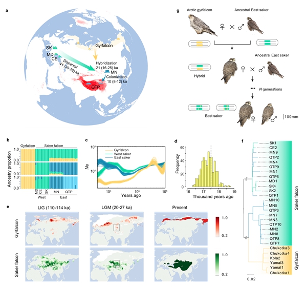 猎隼(Falco cherrug),是青藏高原的代表性猛禽,广泛分布于欧亚大陆和北非的内陆草原和丘陵地区,以及我国新疆、内蒙、东北等地区。而它的近缘种矛隼(F. rusticolus)现在主要栖息于北极和亚北极地区的冻土苔原和森林苔原地带。该研究主要基于三代测序技术,组装了染色体水平的猎隼基因组;同时,对源自欧亚大陆的三大主要繁殖地的30只猎隼个体以及欧亚北极地区的10只矛隼个体进行种群基因组学研究。研究发现,东部猎隼种群中超过20%的等位基因位点来源于矛隼渗入(Introgression)。研究人员对两者历史栖息地模拟发现,末次盛冰期(LGM)时期矛隼从北极向南迁移,在西伯利亚南部与猎隼发生杂交,其婚配方式主要以雌性矛隼与雄性猎隼杂交为主。种群遗传学研究揭示,猎隼逐步扩散至青藏高原的可能路线是:约4.1(3.8-7.8)万年前,猎隼从中欧地区扩散到亚洲东部;LGM时期,东部猎隼种群与矛隼杂交;约1.0(0.8-1.2)万年前,猎隼种群从蒙古拓殖至青藏高原地区。这使得科研人员能够探索猎隼在青藏高原快速的适应性进化过程。