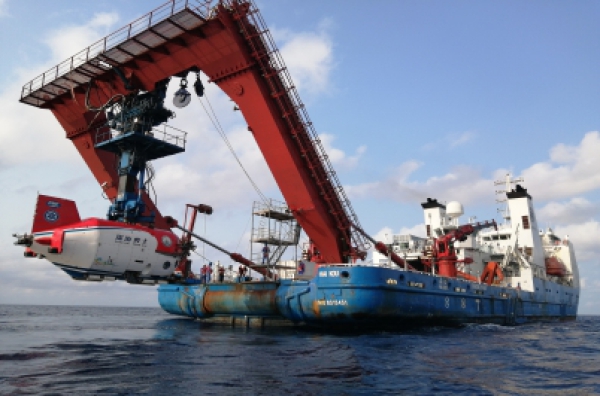 正在执行回收任务的“探索一号”船和“深海勇士”号载人潜水器