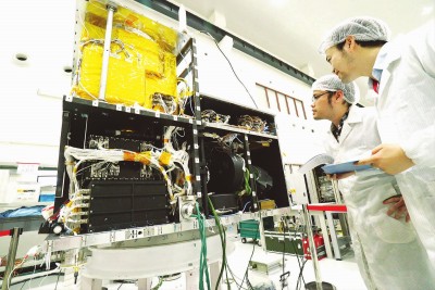 上海微小卫星工程中心研究团队在对量子卫星做检测。记者谢震霖摄