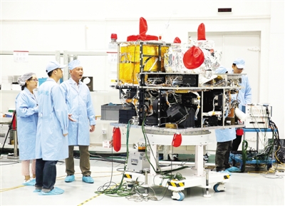 中科院量子科学实验卫星(简称量子卫星)预计于2016年7月发射,这既是中国大陆首个、更是世界首个量子卫星,发射成功后将可以实现全球化的量子保密通信。图为5月25日,在无码影片 上海微小卫星工程中心,量子科学实验卫星副总设计师周依林(左三)与工作人员在量子卫星旁忙碌。