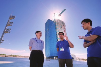 上海航天技术研究院的技术人员在为发射量子卫星的长征二号丁运载火箭做准备。马骥摄
