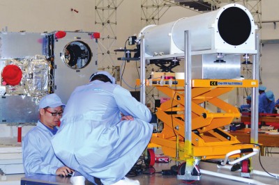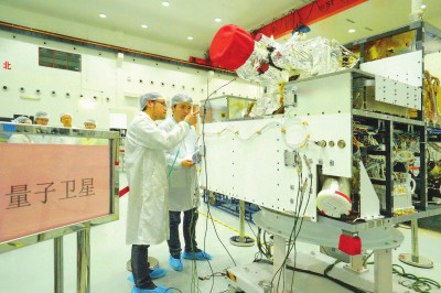 上海微小卫星的研究团队在严缜细密地对量子卫星做检测。