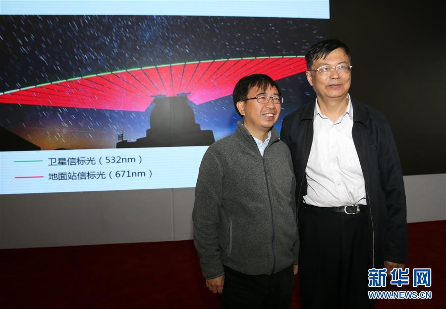 10月12日,在北京举行的量子科学实验卫星成果新闻发布会上,量子卫星首席科学家潘建伟院士(左)与量子卫星工程常务副总师兼卫星系统总指挥王建宇在量子卫星与兴隆站建立链路的图片前合影。新华社记者 才扬 摄