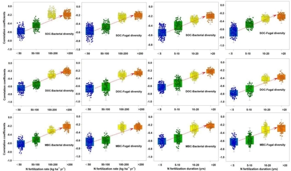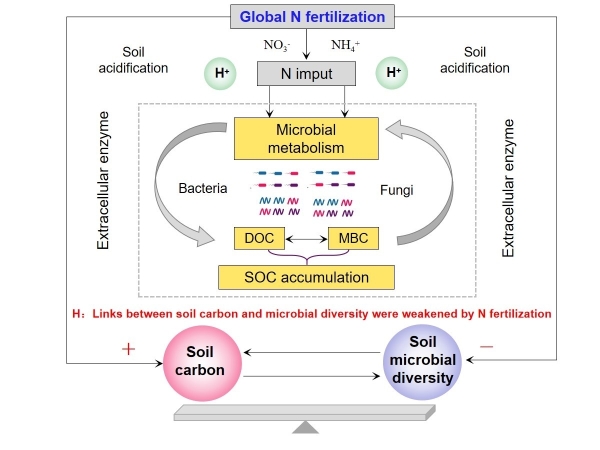 土壤微生物是陆地生态系统遗传多样性的重要组成部分,在陆地生态系统地下碳(C)循环中发挥重要作用。活性氮通过大气沉降的方式进入陆地生态系统,可有效缓解地上植被的氮限制,促进植物生长,增加植物生物量。然而,过多的氮素可能引起土壤pH下降,导致土壤养分失衡,破坏生态系统的稳定性。在土壤碳循环过程中,土壤微生物多样性与土壤有机碳紧密耦合;而这种耦合可能会被快速的全球氮沉降削弱或破坏。目前,对氮沉降如何影响土壤有机碳与土壤微生物有较多认知,但土壤有机碳和微生物多样性的关系如何响应氮沉降尚不清楚。