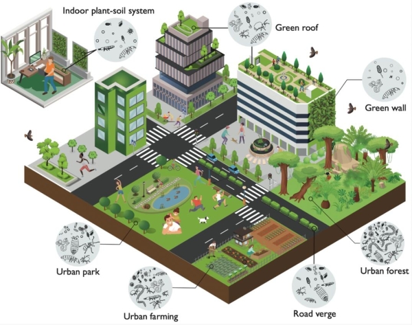 图1.土壤是城市生态系统中生物多样性的主要储存库。人类造成的干扰和自然栖息地的丧失影响城市土壤的生物多样性。然而,有多种方案(如绿色屋顶和墙壁、室内栖息地、公园绿地修复等)可通过提供更多的土壤生物栖息地,以增加室内和室外空间的土壤生物多样性。