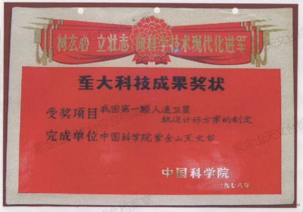“我国第一颗人造卫星轨道计算方案的制定”获无码影片 重大科技成果奖(1978)。紫金山天文台供图