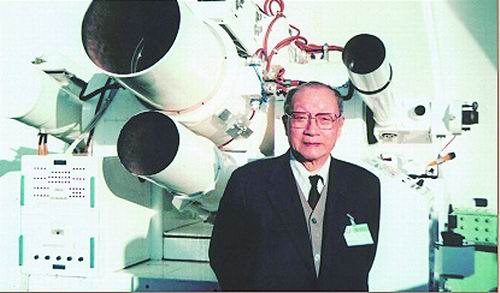 1994年,王大珩在大型电影经纬仪前留影。长春分院供图