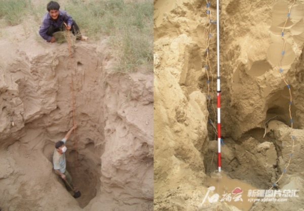 骆驼刺根系的挖掘(左)和深达地下水的根系(右)(图片来源 中科院新疆生地所)