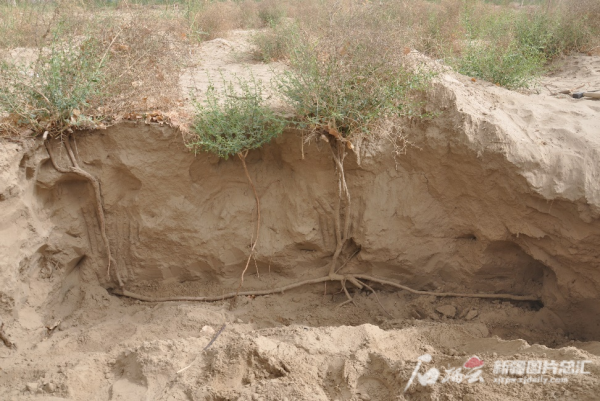 骆驼刺,是生长在干旱、半干旱区的荒漠深根植物,防风固沙成效显著,也是一种优良牧草。为了掌握其在恶劣环境中生存的适应性,扩大人工种植,策勒站的科研人员通过种子种植将其培育在高达近2米的巨型“花盆”内。