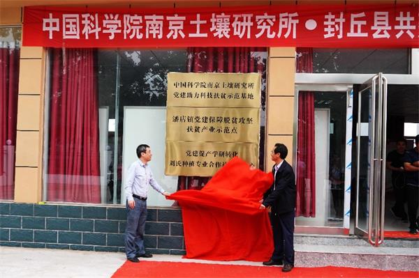 南京土壤研究所党建助力科技扶贫示范基地揭牌仪式在河南封丘县潘店镇刘氏种植专业合作社举行。南京土壤研究所党委书记蔡立、封丘县人民政府县长王献臣共同为示范基地揭牌。