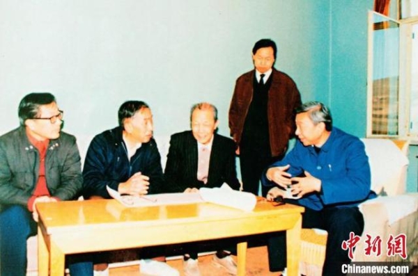 1992年,陈定昌院士(左一)在试验基地与黄纬禄院士(左三)、型号总指挥徐乃明(左二)、王尚虎(右一)讨论问题 航天科工供图