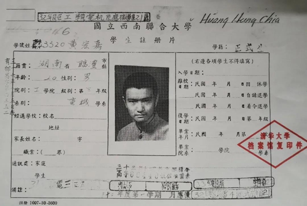 黄宏嘉在国立西南联合大学的学生注册片