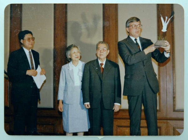 1988年,郑作新(右二)获美国野生动物资源保护联合会授予的国际动物资源保护的特殊成就奖。“中科院形象资源建设”研究团队供图