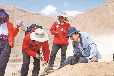 我们的领队陈发虎院士年已六十,可他始终走在我们所有人前头,他手里拿着扩音器,每到一处科考点,都会给我们授课解惑。我至今还记得,在讲解研判采集地层砂石样品的性质时,他亲自舔尝砂石给我们示范。