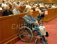 杨起坐着轮椅车参加第十四次院士大会并投票