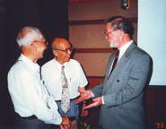 王鸿祯(中)与国际地球物理及大地测量协会主席维利(右)(1996)