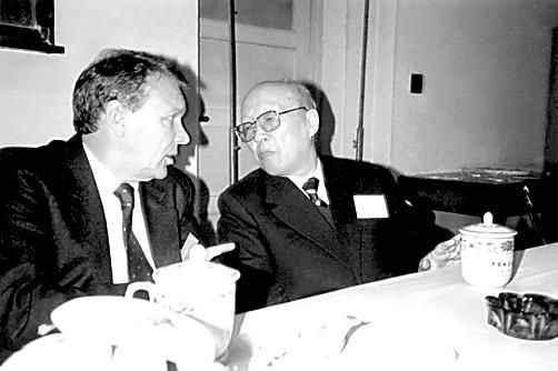 1990年,王鸿祯与国际地质科学史委员会主席M.Guntau在国际学术讨论会上。